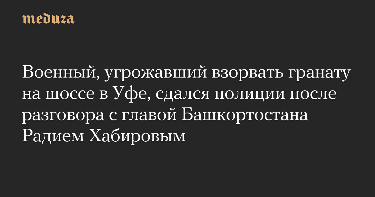 Российский военный, угрожавший взорвать гранату на шоссе в Уфе, сдался властям после разговора с главой Башкортостана Радием Хабировым, сообщает РБК-Уфа.