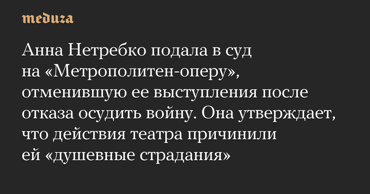 Анна Нетребко подала в суд на «Метрополитен-оперу», отменившую ее выступления после отказа осудить войну. Она утверждает, что действия театра причинили ей «душевные страдания»