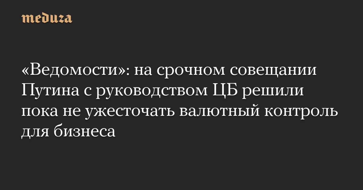 «Ведомости»: на срочном совещании Путина с руководством ЦБ решили пока не ужесточать валютный контроль для бизнеса