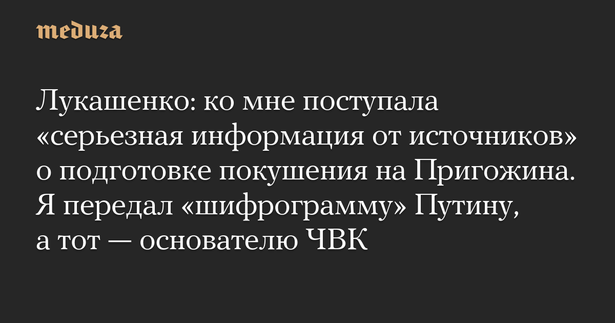 Лукашенко: ко мне поступала «серьезная информация от источников» о подготовке покушения на Пригожина. Я передал «шифрограмму» Путину, а тот — основателю ЧВК