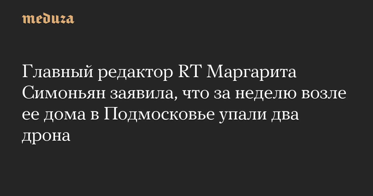 Главный редактор RT пропагандистка Маргарита Симоньян заявила РИА Новости, что возле ее дома в Московской области упал второй за неделю дрон.