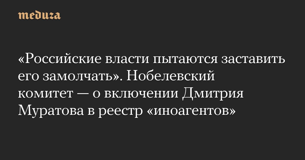 Норвежский Нобелевский комитет, который ежегодно выбирает лауреатов Нобелевской премии мира, осудил решение российских властей включить главного редактора «Новой газеты» и лауреата премии Дмитрия Муратова в реестр «иностранных агентов». Об этом говорится в заявлении председателя комитета Берит Рейсс-Андерсен, которое опубликовало агентство AFP.