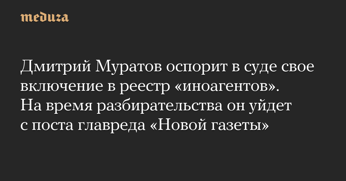 Дмитрий Муратов оспорит в суде свое включение в реестр «иноагентов». На время разбирательства он уйдет с поста главреда «Новой газеты»