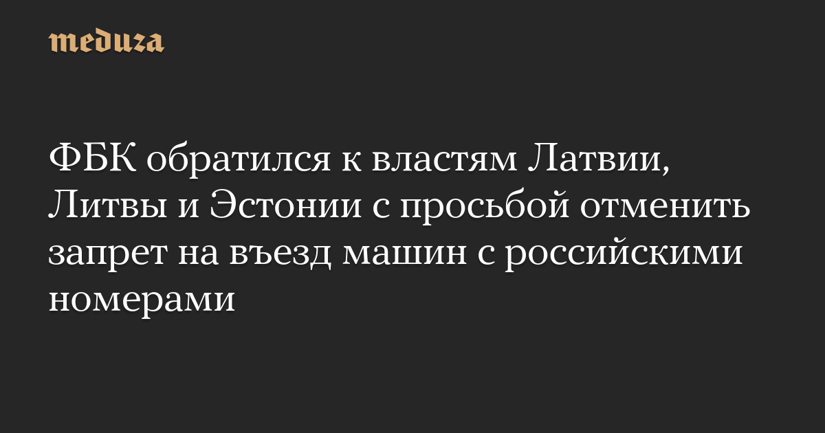 Фонд борьбы с коррупцией обратился к властям Латвии, Литвы и Эстонии с просьбой пересмотреть решение о запрете на въезд машин с номерами РФ, а также изъятии у россиян личных вещей на границе. Пример письма, которое фонд разослал уполномоченным органам трех стран, опубликовала председатель совета директоров ФБК Мария Певчих.