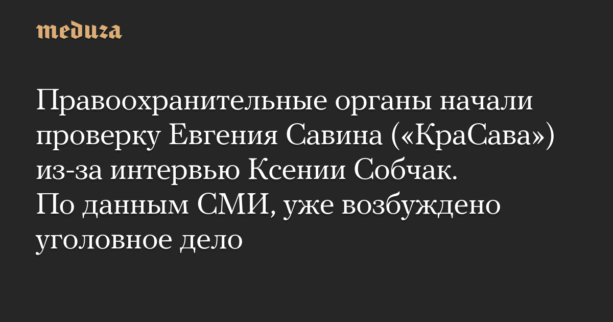 Правоохранительные органы начали проверку Евгения Савина («КраСава») из-за интервью Ксении Собчак. По данным СМИ, уже возбуждено уголовное дело