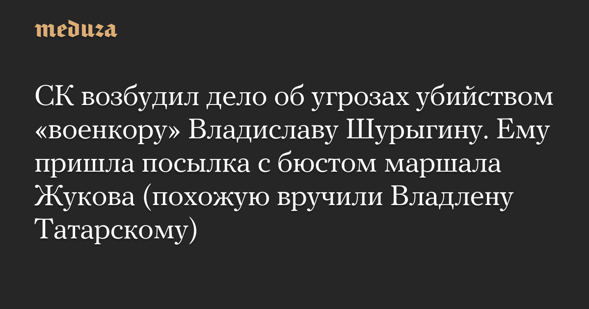 СК возбудил дело об угрозах убийством «военкору» Владиславу Шурыгину. Ему пришла посылка с бюстом маршала Жукова (похожую вручили Владлену Татарскому)