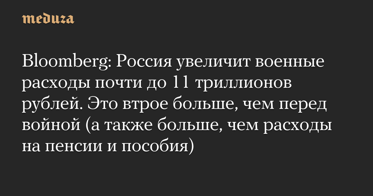 Bloomberg: Россия увеличит военные расходы почти до 11 триллионов рублей. Это втрое больше, чем перед войной (а также больше, чем расходы на пенсии и пособия)
