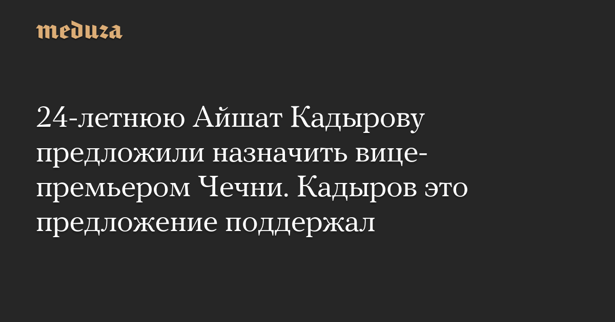 Председатель правительства Чечни Муслим Хучиев предложил назначить 24-летнюю Айшат Кадырову на должность вице-премьера Чечни по социальным вопросам. Об этом в своем телеграм-канале сообщил ее отец и глава республики Рамзан Кадыров.