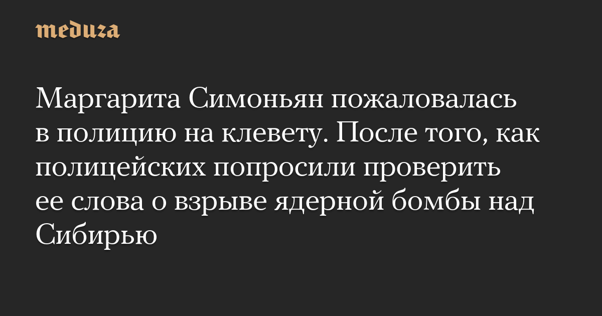 Маргарита Симоньян пожаловалась в полицию на клевету. После того, как полицейских попросили проверить ее слова о взрыве ядерной бомбы над Сибирью