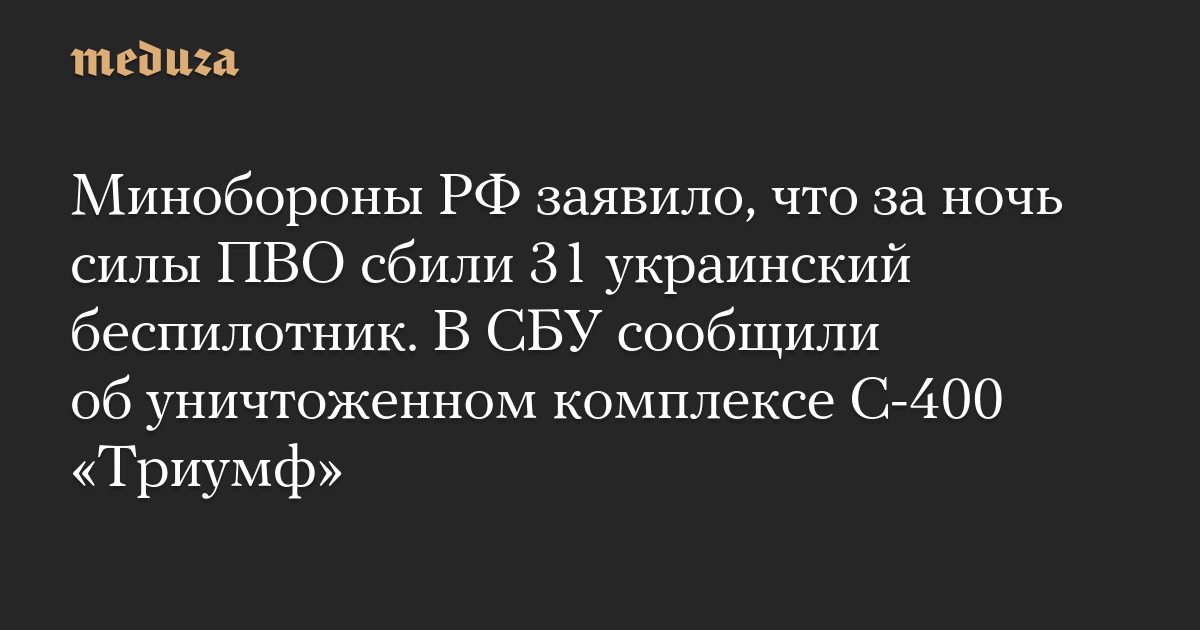 Минобороны РФ заявило, что за ночь силы ПВО сбили 31 украинский беспилотник. В СБУ сообщили об уничтоженном комплексе С-400 «Триумф»