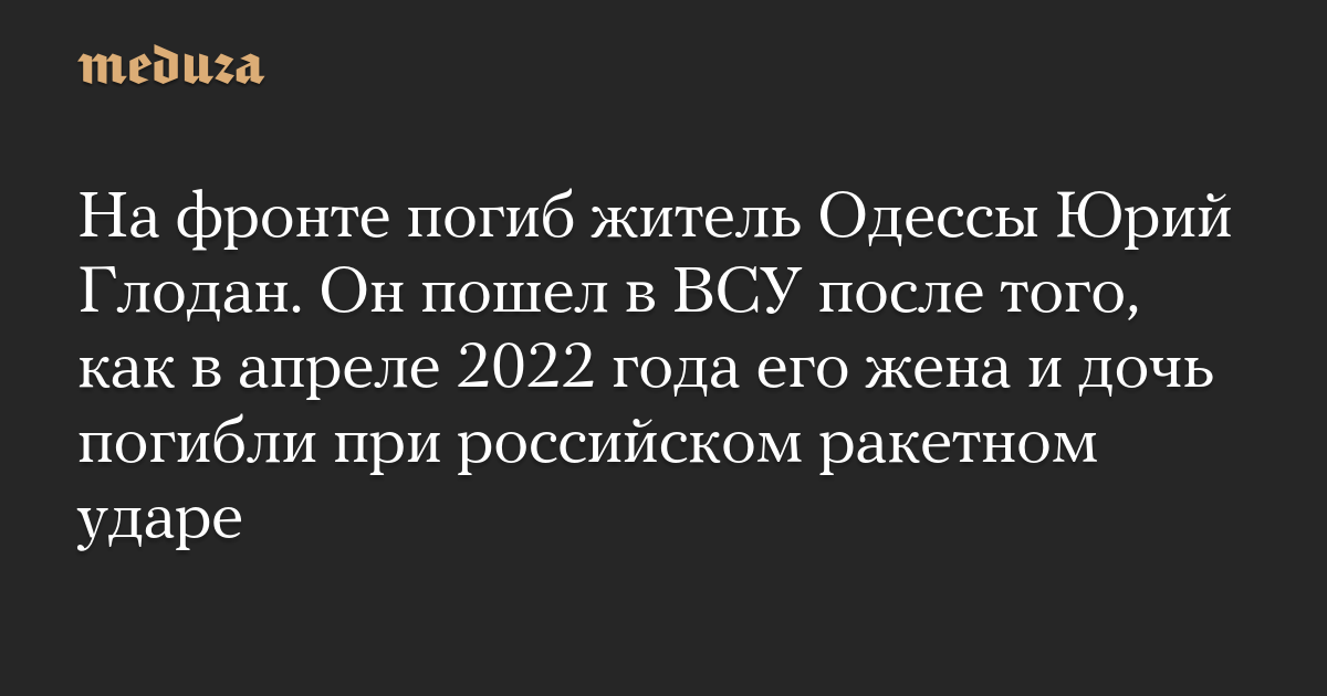 На фронте погиб житель Одессы Юрий Глодан. Он пошел в ВСУ после того, как в апреле 2022 года его жена и дочь погибли при российском ракетном ударе