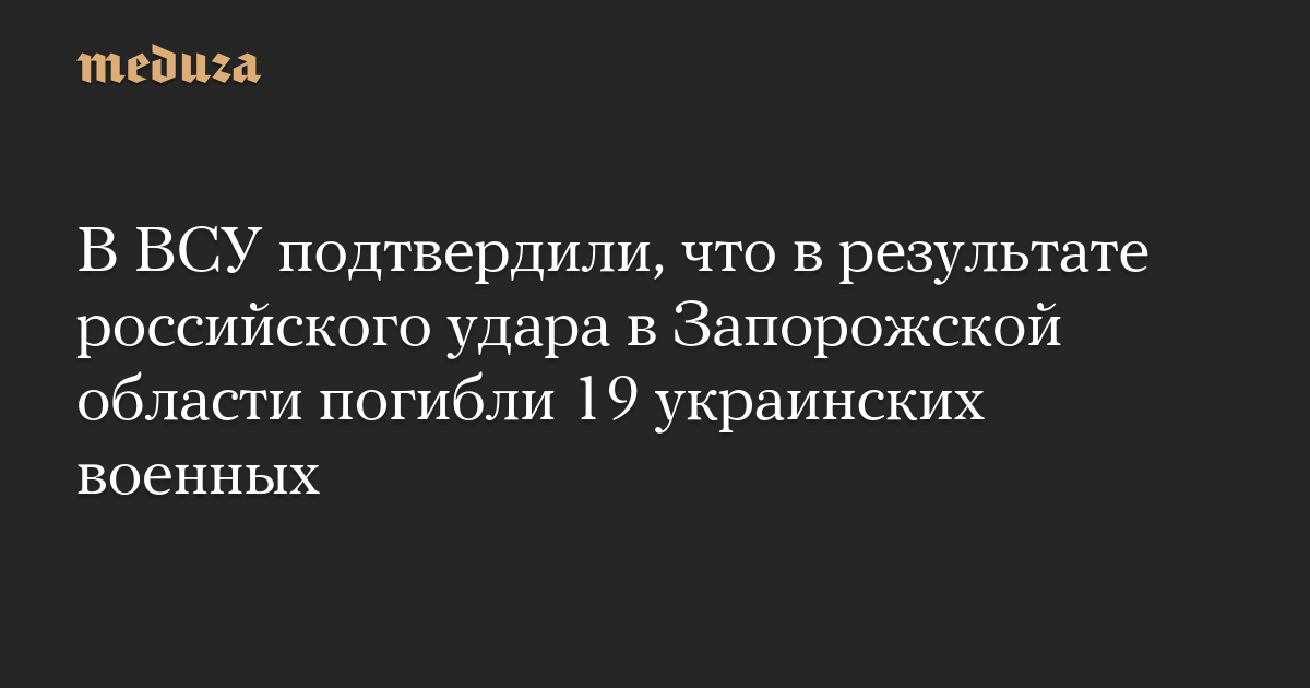В ВСУ подтвердили, что в результате российского удара в Запорожской области погибли 19 украинских военных