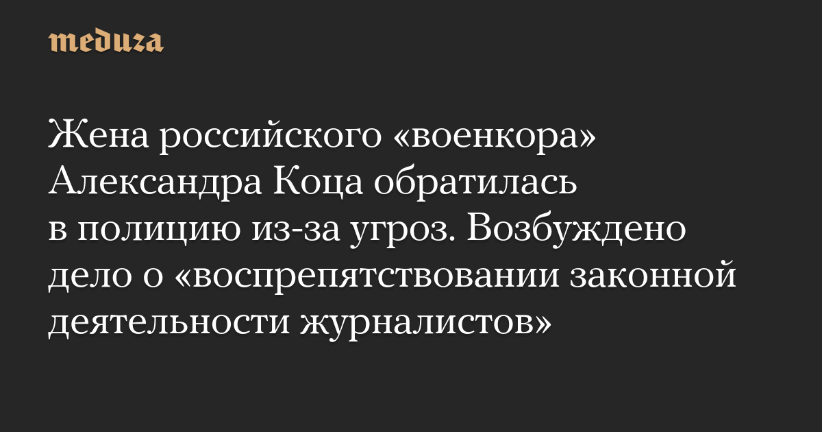 Жена российского «военкора» Александра Коца обратилась в полицию из-за угроз. Возбуждено дело о «воспрепятствовании законной деятельности журналистов»