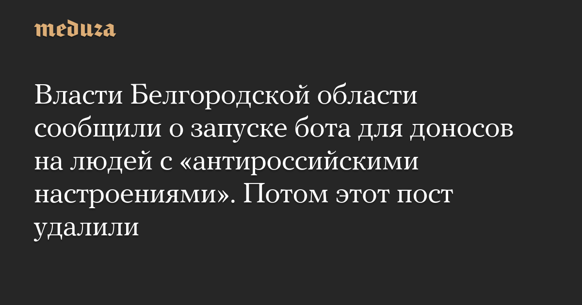 Власти Белгородской области сообщили о запуске бота для доносов на людей с «антироссийскими настроениями». Потом этот пост удалили