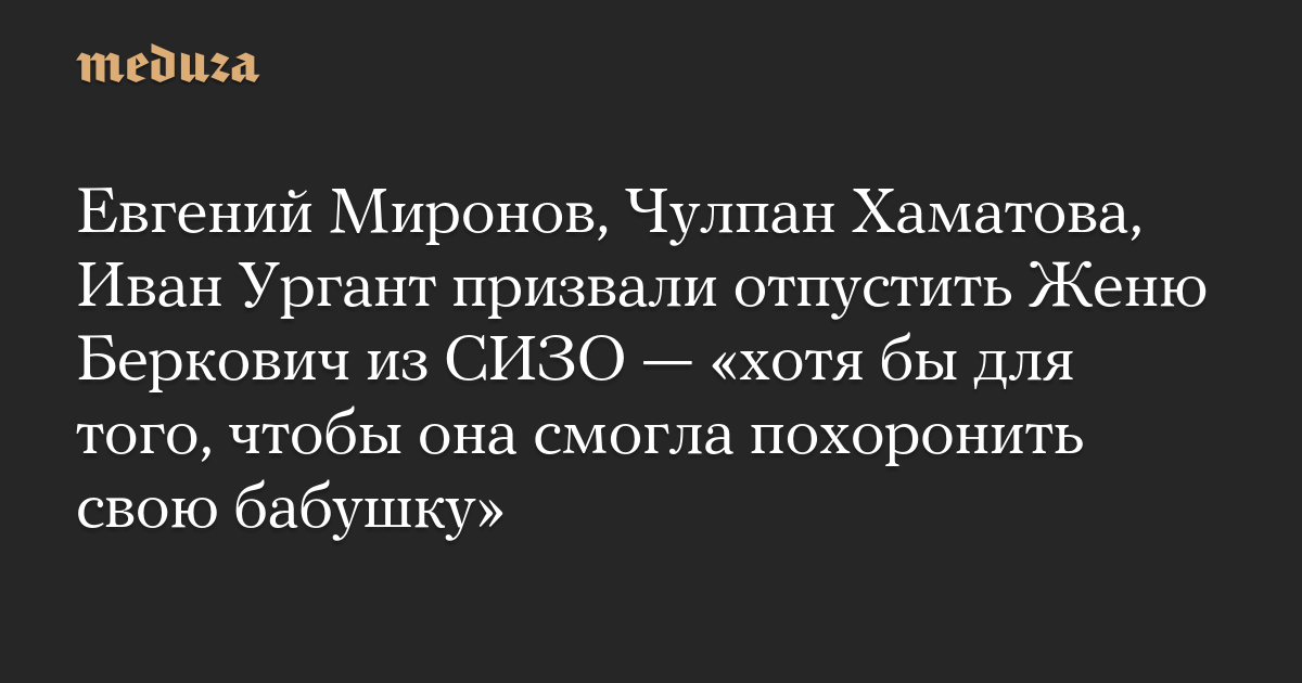Евгений Миронов, Чулпан Хаматова, Иван Ургант призвали отпустить Женю Беркович из СИЗО — «хотя бы для того, чтобы она смогла похоронить свою бабушку»