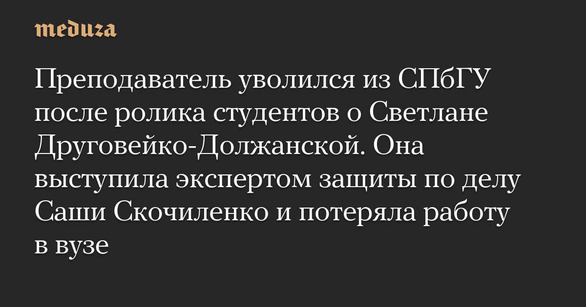 Преподаватель уволился из СПбГУ после ролика студентов о Светлане Друговейко-Должанской. Она выступила экспертом защиты по делу Саши Скочиленко и потеряла работу в вузе