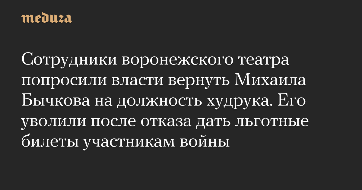 Сотрудники воронежского театра попросили власти вернуть Михаила Бычкова на должность худрука. Его уволили после отказа дать льготные билеты участникам войны