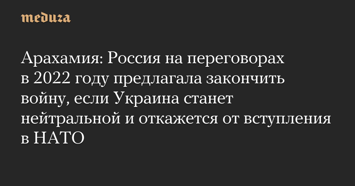 Лидер фракции «Слуга народа» в Верховной раде Давид Арахамия, который возглавлял делегацию Украины на переговорах с Россией, рассказал, что весной 2022 года российская делегация предлагала закончить войну, если Украина откажется вступать в НАТО.