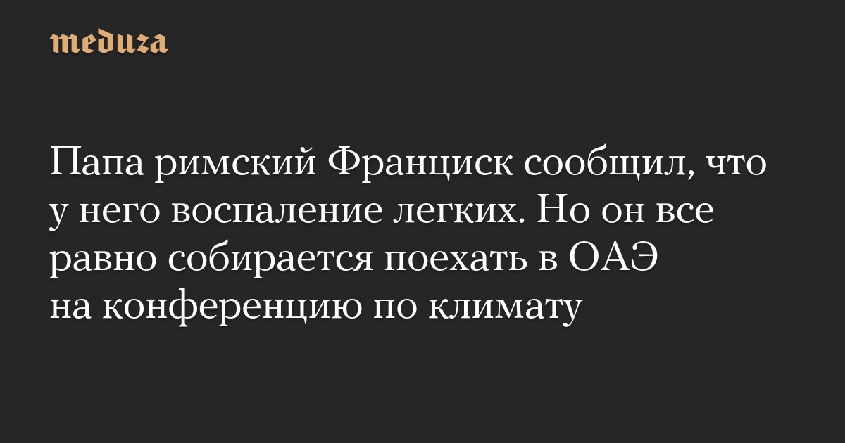 Папа римский Франциск сообщил, что у него воспаление легких. Но он все равно собирается поехать в ОАЭ на конференцию по климату