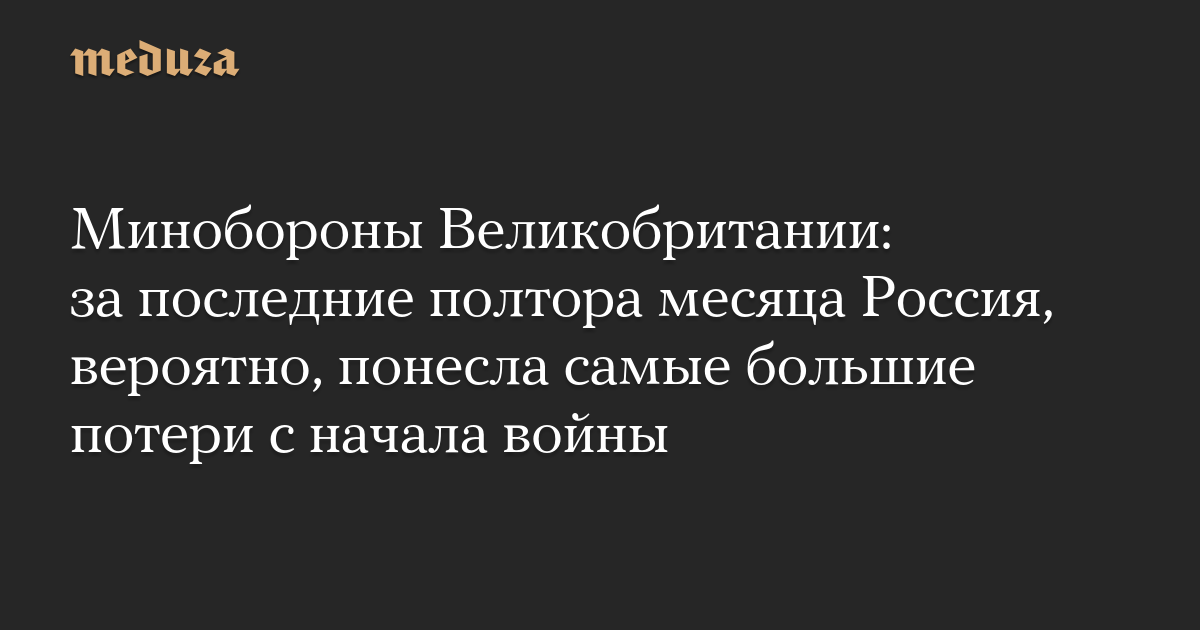Российские войска за последние полтора месяца, вероятно, понесли одни из самых высоких потерь за все время войны, говорится в ежедневной сводке разведки Минобороны Великобритании, основанной на данных Генштаба ВСУ.