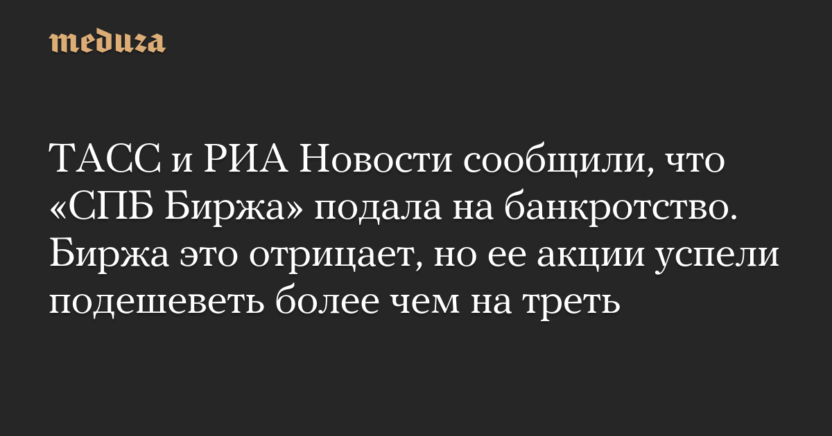 ТАСС и РИА Новости сообщили, что «СПБ Биржа» подала на банкротство. Биржа это отрицает, но ее акции успели подешеветь более чем на треть