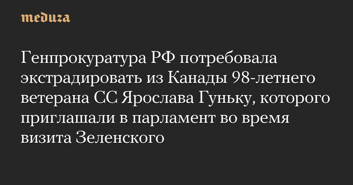 Генпрокуратура РФ потребовала экстрадировать из Канады 98-летнего ветерана СС Ярослава Гуньку, которого приглашали в парламент во время визита Зеленского