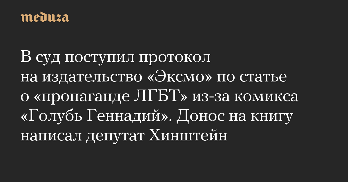 В суд поступил протокол на издательство «Эксмо» по статье о «пропаганде ЛГБТ» из-за комикса «Голубь Геннадий». Донос на книгу написал депутат Хинштейн