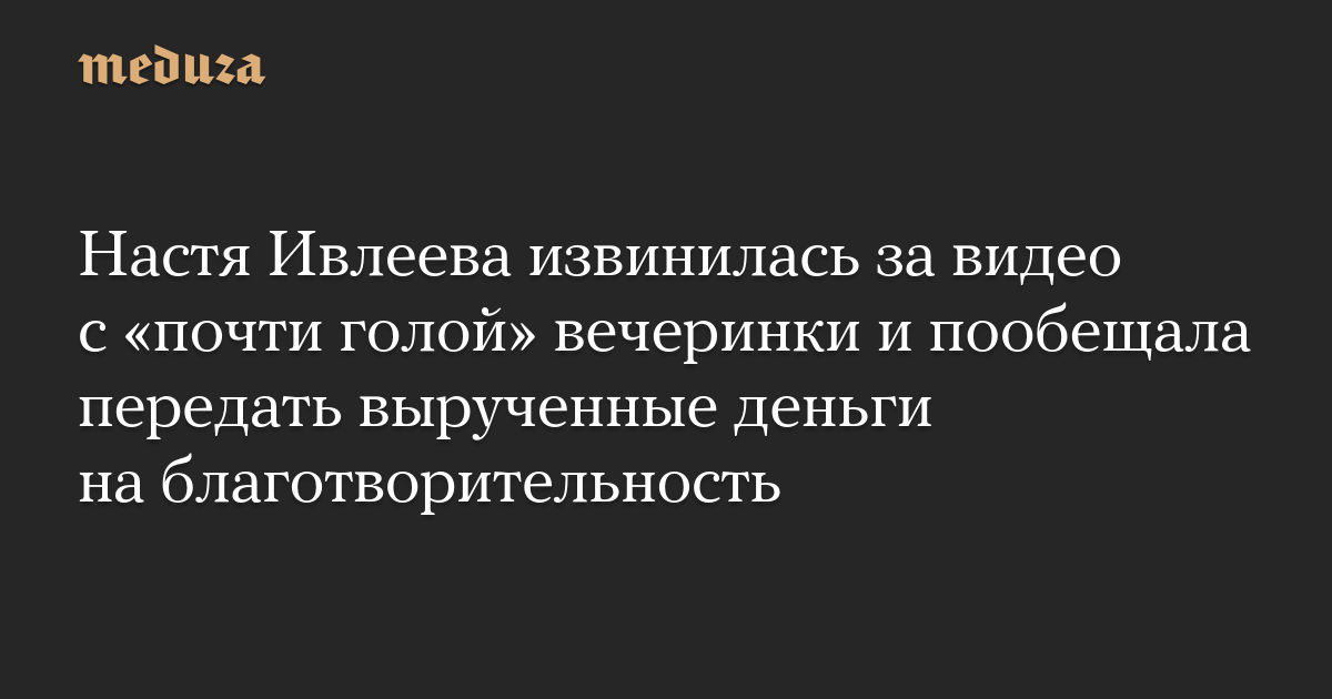 Блогер и телеведущая Настя Ивлеева заявила, что передаст в благотворительные организации все деньги, вырученные с продажи билетов на второй день вечеринки в московском клубе «Мутабор», где действовал дресс-код almost naked («почти голый»). Об этом говорится в видео, которое записала Ивлеева.