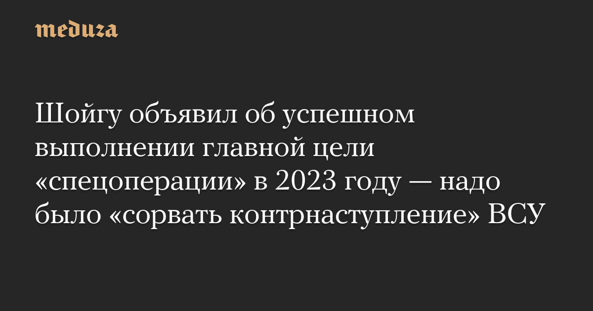 «Основные усилия в уходящем году были сосредоточены на достижении целей специальной военной операции. Главная из них — сорвать громко заявленное Украиной и ее натовскими союзниками контрнаступление вооруженных сил Украины. Эта задача успешно выполнена», — сказал Шойгу на итоговом селекторном совещании, запись которого опубликовало РИА Новости.
