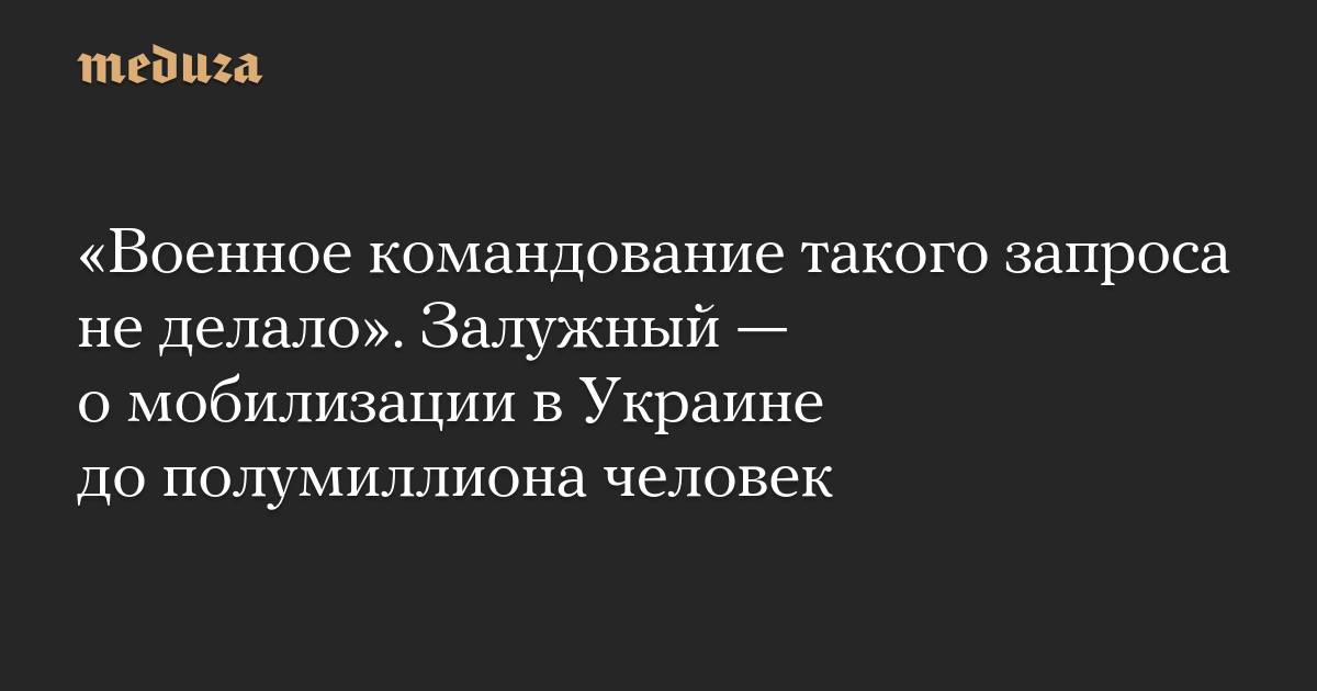 Главнокомандующий ВСУ Валерий Залужный заявил, что военное командование Украины постоянно формирует свои запросы на боеприпасы, оружие и человеческий ресурс, но запрос на конкретное число мобилизованных не подавало.