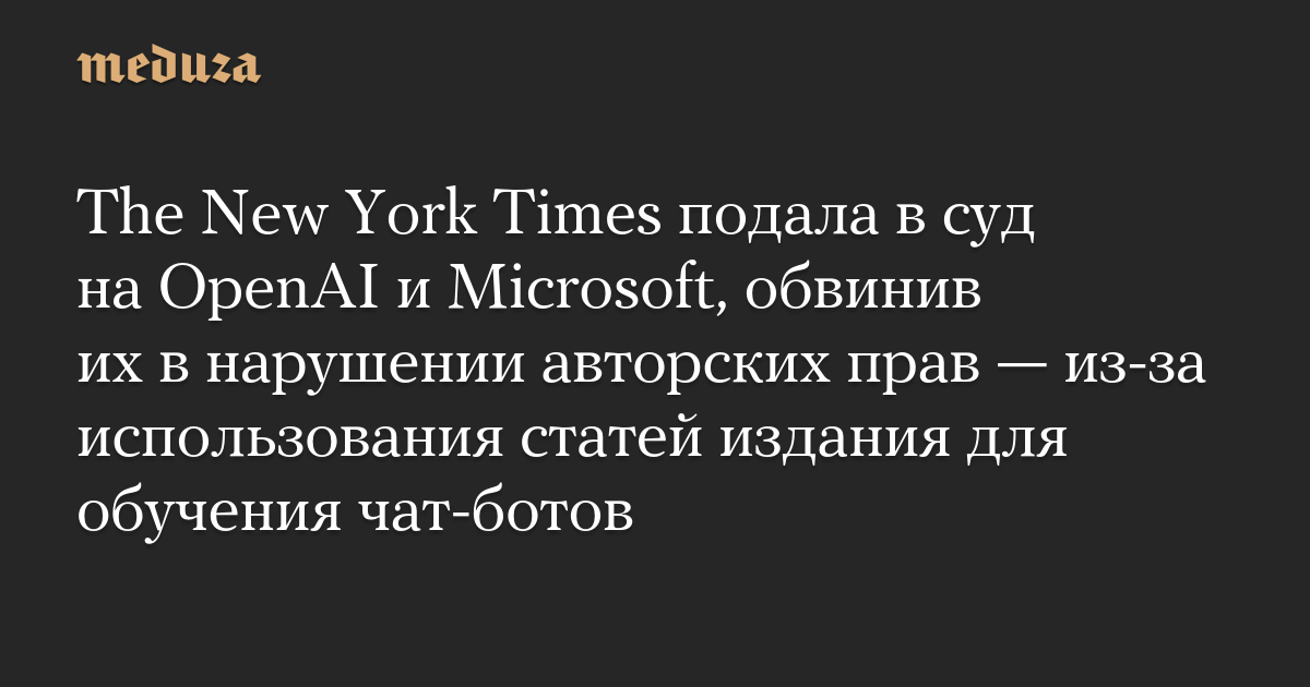 Газета The New York Times подала в суд на OpenAI и Microsoft, обвинив их в нарушении авторских прав — в издании утверждают, что миллионы статей NYT были незаконно использованы для обучения чат-ботов, в том числе ChatGPT.