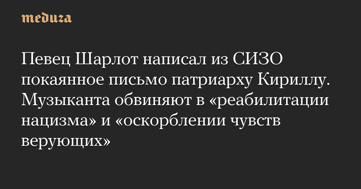 Певец Шарлот написал из СИЗО покаянное письмо патриарху Кириллу. Музыканта обвиняют в «реабилитации нацизма» и «оскорблении чувств верующих»