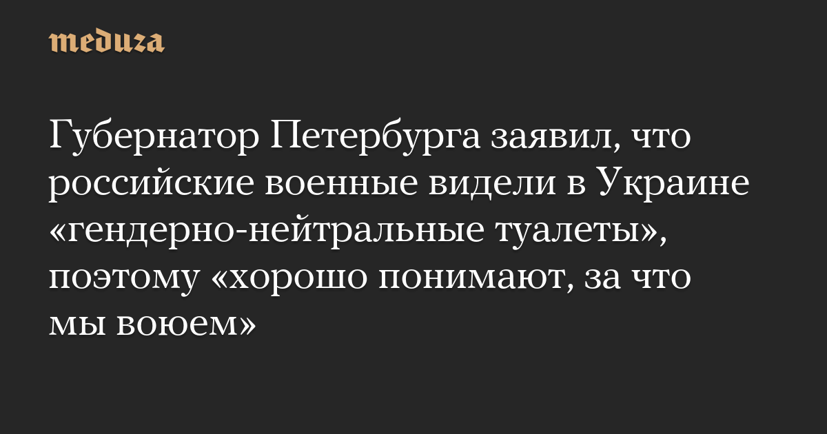 Губернатор Петербурга заявил, что российские военные видели в Украине «гендерно-нейтральные туалеты», поэтому «хорошо понимают, за что мы воюем»