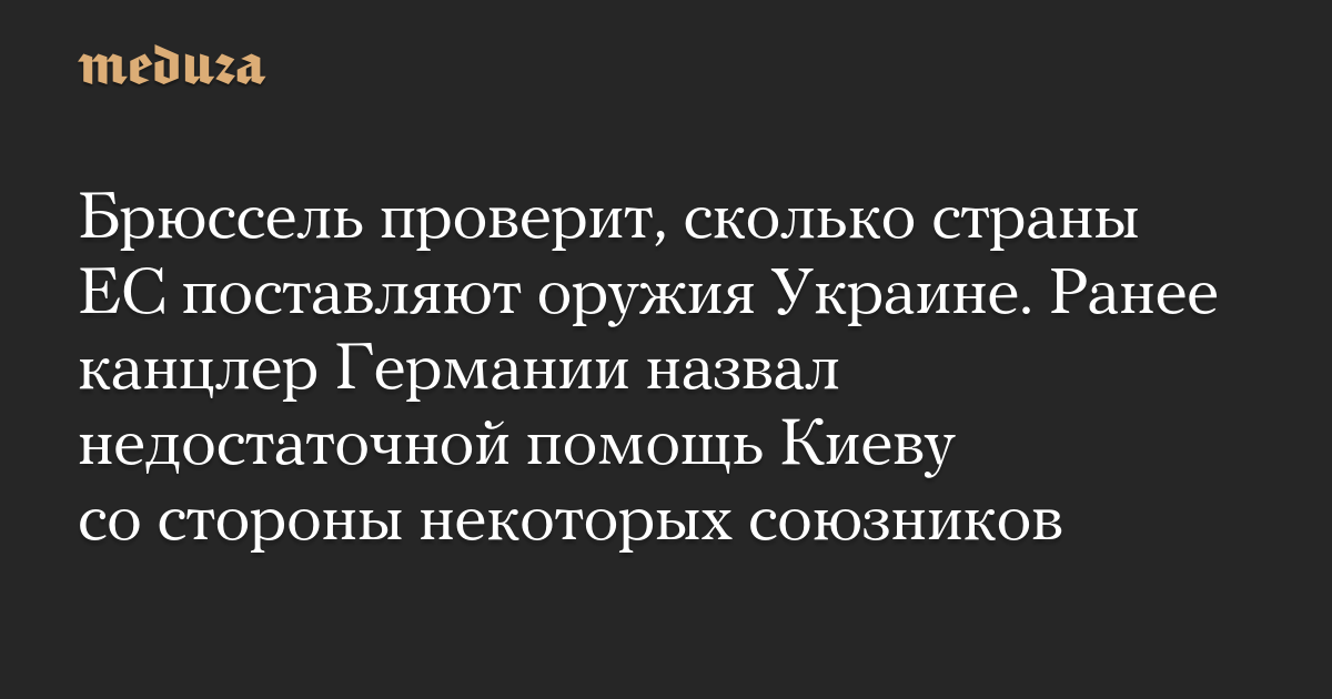 Брюссель проверит, сколько страны ЕС поставляют оружия Украине. Ранее канцлер Германии назвал недостаточной помощь Киеву со стороны некоторых союзников