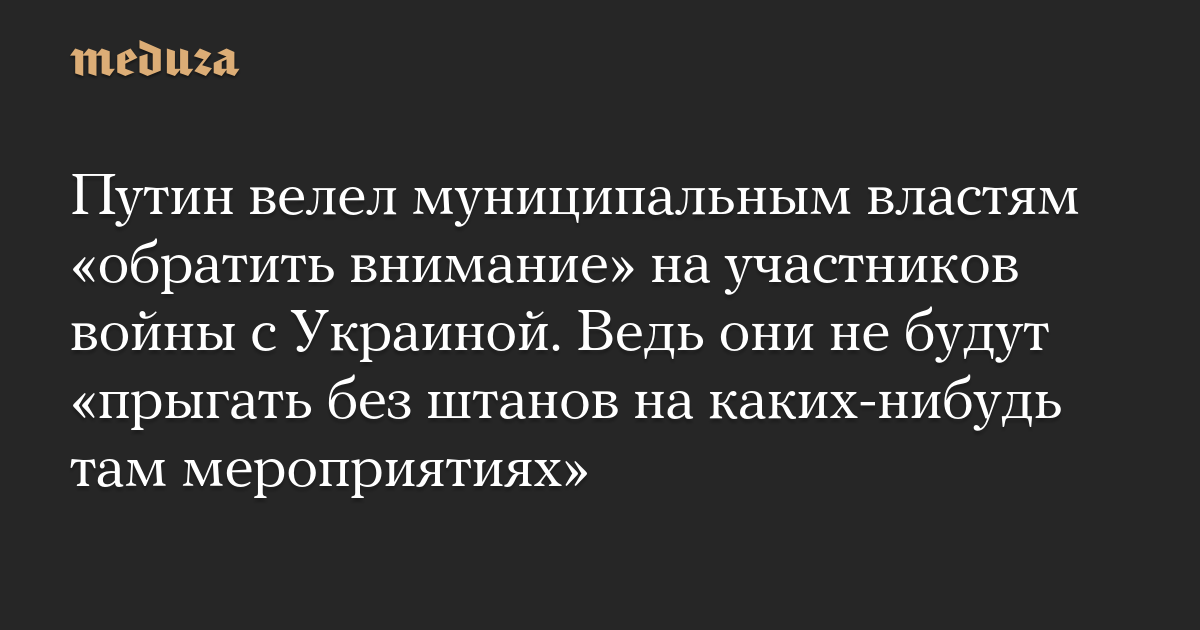 Путин велел муниципальным властям «обратить внимание» на участников войны с Украиной. Ведь они не будут «прыгать без штанов на каких-нибудь там мероприятиях»