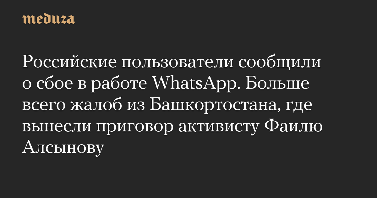 Baza связывает сбой в работе WhatsApp в Башкортостане с акциями протеста из-за приговора активисту Фаилю Алсынову, которого суд города Баймак 17 января признал виновным в разжигании межнациональной розни. Алсынова приговорили к четырем годам лишения свободы в колонии общего режима.