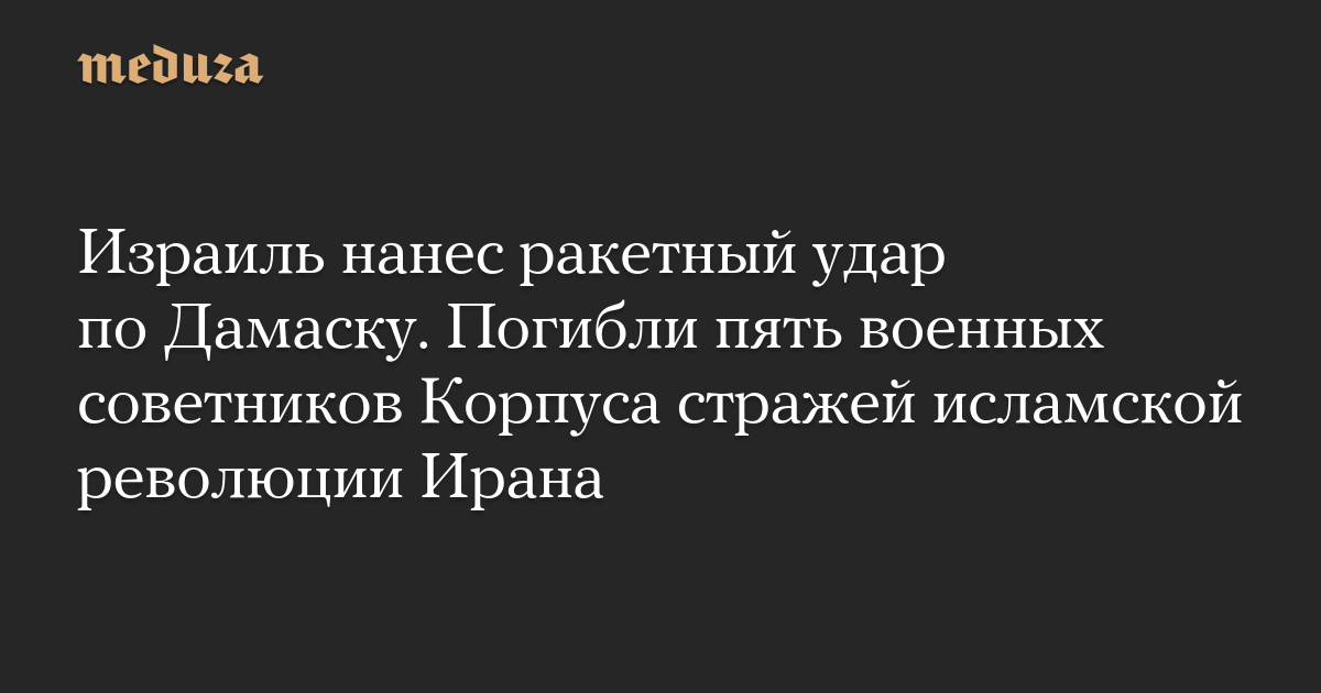 Четыре члена Корпуса стражей исламской революции (КСИР), элитного военно-политического формирования Ирана, погибли при ударе Израиля по Дамаску, столице Сирии, сообщает Reuters со ссылкой на источник. Среди погибших, как утверждается, высокопоставленный сотрудник информационного подразделения КСИР.