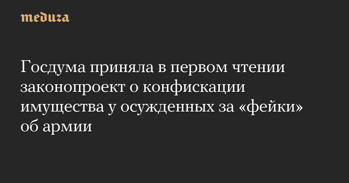Госдума приняла в первом чтении законопроект о конфискации имущества у осужденных по статье о распространении «фейков» про российскую армию, сообщает РИА Новости.