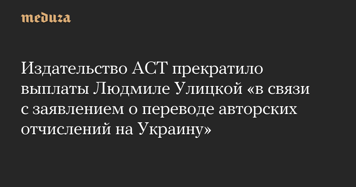 «В связи с заявлением автора о переводе авторских отчислений на Украину издательство АСТ приняло решение о приостановке любых выплат по всем договорам с Улицкой до прояснения ситуации и возможных официальных разъяснений со стороны автора относительно адресатов денежных отчислений с проданных книг», — цитирует ТАСС распространенное издательством заявление.