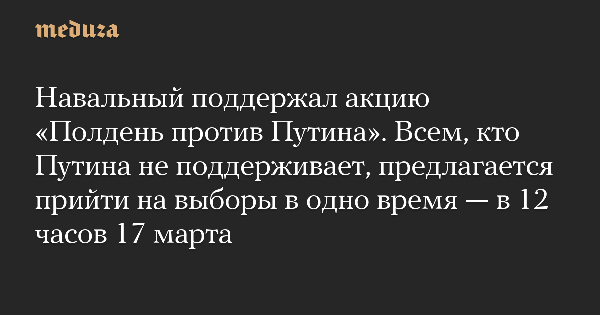 Навальный поддержал акцию «Полдень против Путина». Всем, кто Путина не поддерживает, предлагается прийти на выборы в одно время — в 12 часов 17 марта