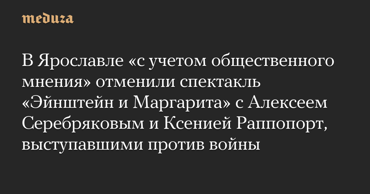 В Ярославле «с учетом общественного мнения» отменили спектакль «Эйнштейн и Маргарита» с Алексеем Серебряковым и Ксенией Раппопорт, выступавшими против войны