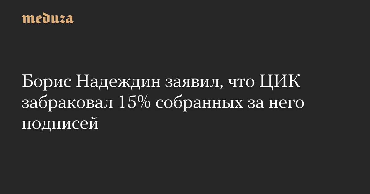 По данным штаба Бориса Надеждина, Центризбирком забраковал 15% подписей, поданных за выдвижение его кандидатом в президенты. Для регистрации кандидатом необходимо, чтобы в проверенных подписях было не более 5% брака.
