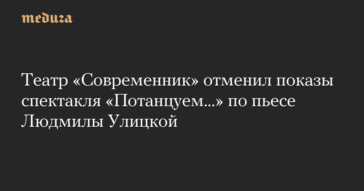 Показы спектакля «Потанцуем…» по пьесе Людмилы Улицкой в московском театре «Современник», запланированные на февраль и март, отменены. Об этом сообщает ТАСС со ссылкой на пресс-службу театра, не уточняя, с чем связано решение об отмене спектаклей.