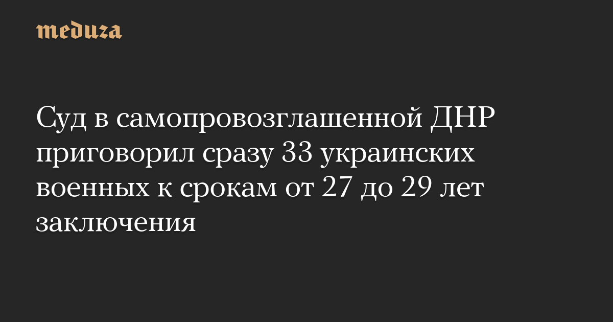 Суд в самопровозглашенной ДНР приговорил 33 украинских военных из 36-й бригады морской пехоты ВМС Украины и 17-й танковой бригады ВСУ к лишению свободы на сроки от 27 до 29 лет заключения в колонии строгого режима.