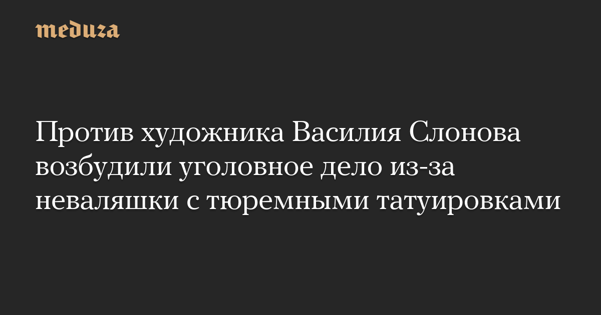 Как пишет «Медиазона», согласно постановлению следователя, дело возбудили вечером 8 февраля, а поводом стала публикация Слонова во «ВКонтакте» с фотографией арт-объекта — неваляшки с имитацией тюремных татуировок, которая демонстрировалась на его выставке в красноярском отеле Novotel.
