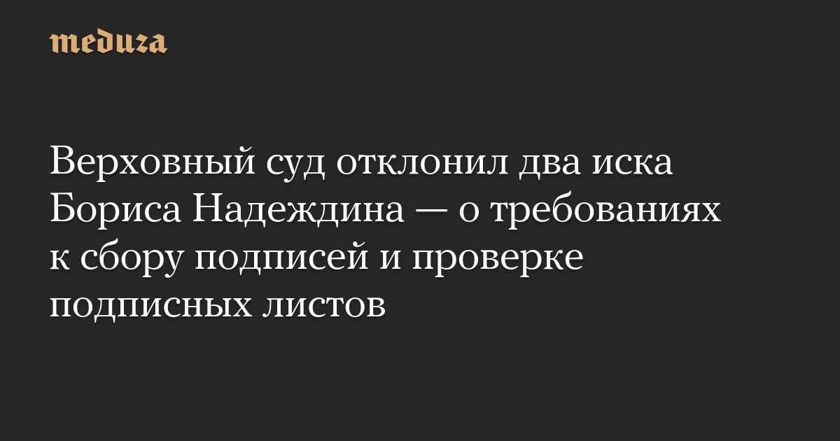 Верховный суд РФ отклонил первый иск Бориса Надеждина, который касался процедуры сбора подписей. Об этом сообщается в телеграм-канале политика.