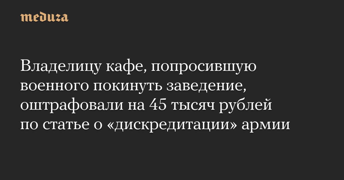 Владелицу кафе, попросившую военного покинуть заведение, оштрафовали на 45 тысяч рублей по статье о «дискредитации» армии