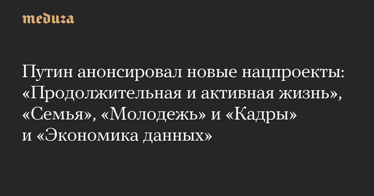 Путин анонсировал новые нацпроекты: «Продолжительная и активная жизнь», «Семья», «Молодежь», «Кадры», «Технологический суверенитет» и «Экономика данных»