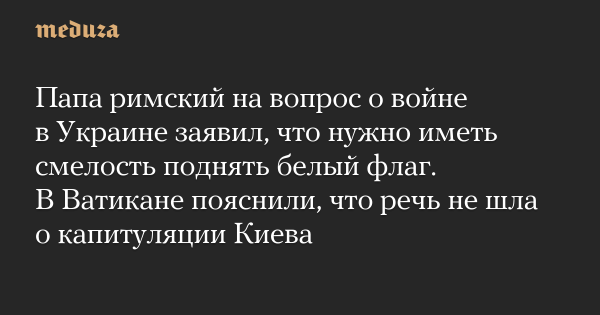 Представитель Ватикана Маттео Бруни заявил, что папа римский Франциск не имел в виду, что Украина должна сдаться России, когда говорил о том, что «сильнее всех тот, кто думает о народе, имеет смелость поднять белый флаг и вести переговоры».