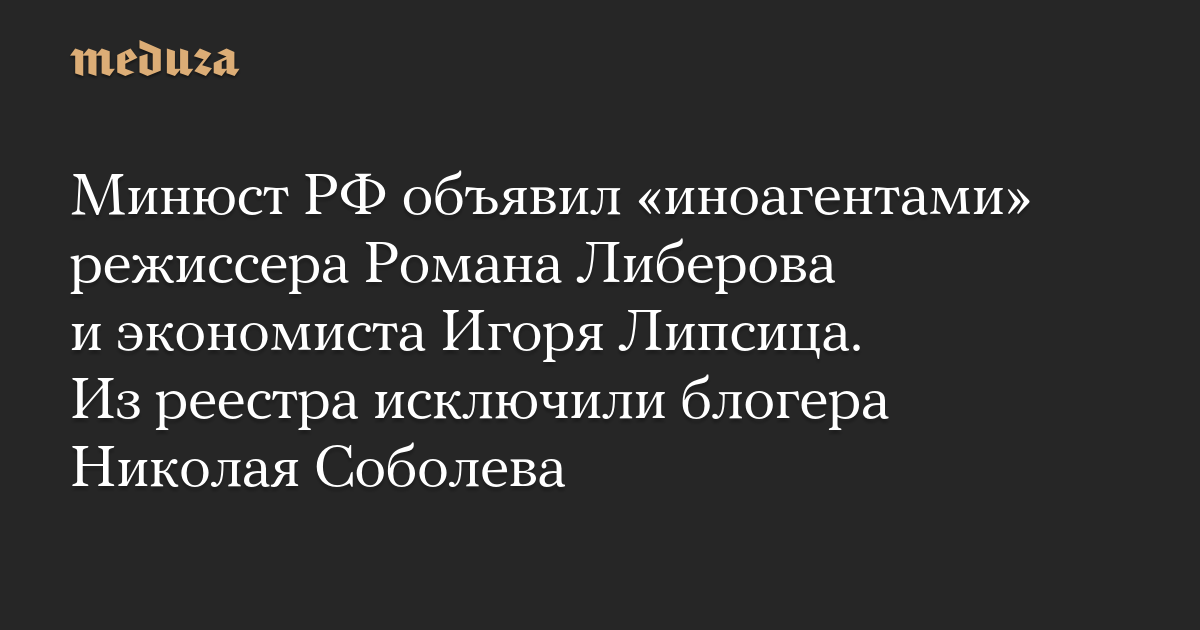 Минюст РФ объявил «иноагентами» режиссера Романа Либерова и экономиста Игоря Липсица. Из реестра исключили блогера Николая Соболева